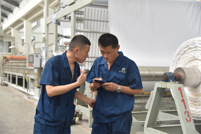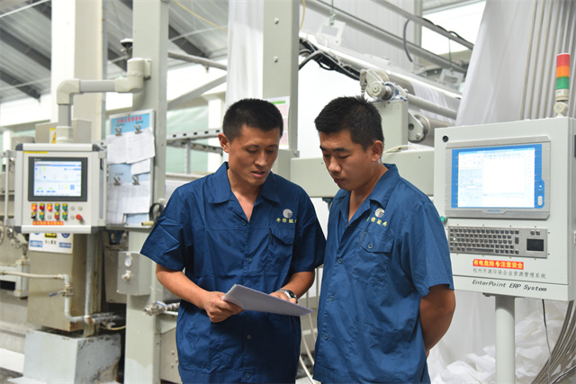 孫鎮(zhèn)身著工裝,每天巡回在車間前處理機臺之間,和暢的機聲成了他工作之時的伴奏。落實各機臺的計劃,組織各機臺生產(chǎn)跟進,管控本班的產(chǎn)品質(zhì)量,對操作規(guī)范進行及時檢查、現(xiàn)場糾偏與指導(dǎo)培訓(xùn)。他一心撲在工作上,每天忙得不亦樂乎,目標(biāo)是帶領(lǐng)全班19名成員保質(zhì)保量地完成車間下達的任務(wù)目標(biāo)。他說,“做好生產(chǎn)工作有兩件法寶:一個是責(zé)任感,一個就是精益生產(chǎn)意識。”在孫鎮(zhèn)的心目中,作為公司的管理主線,精益生產(chǎn)需要全體“華紡人”共同傾心“打磨”,在時間里“磨”出真功夫來,干工作沒有捷徑,反復(fù)推敲,仔細琢磨;經(jīng)過工作實踐的摸爬滾打,才能提升自身本領(lǐng),才會使生產(chǎn)工作一步步精進。