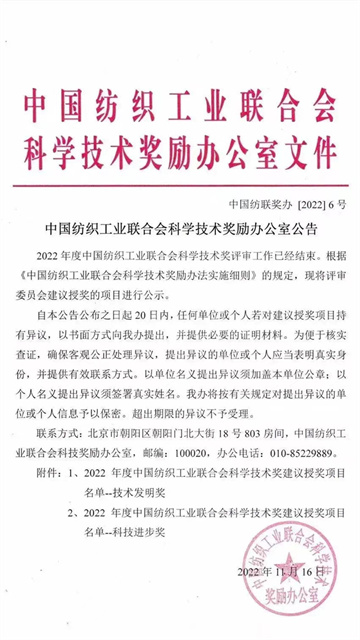 導(dǎo)讀:中國紡織工業(yè)聯(lián)合會(huì)向社會(huì)公示了“2022年度科學(xué)技術(shù)獎(jiǎng)授獎(jiǎng)項(xiàng)目名單”,公司“全流程印染過程數(shù)字化控制技術(shù)研究與應(yīng)用示范”成果,獲得全國紡織行業(yè)2022年度技術(shù)進(jìn)步獎(jiǎng)二等獎(jiǎng)。