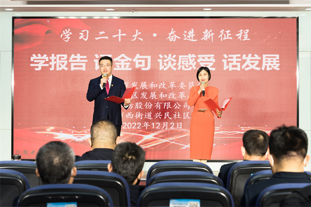 為持續(xù)深入學(xué)習(xí)領(lǐng)會、全面準(zhǔn)確把握黨的二十大精神,12月2日,濱州市發(fā)展改革委聯(lián)合濱城區(qū)發(fā)展和改革局、華紡股份有限公司、市西街道興民社區(qū)舉辦“學(xué)習(xí)二十大·奮進(jìn)新征程·學(xué)報告、誦金句、談感受、話發(fā)展”活動。團(tuán)市委副書記丁寶冬、華紡股份有限公司黨委委員、人力行政總監(jiān)孫玉濤出席活動。市發(fā)展改革委、濱城區(qū)發(fā)展和改革局、華紡股份有限公司、興民社區(qū)黨員代表參加活動。