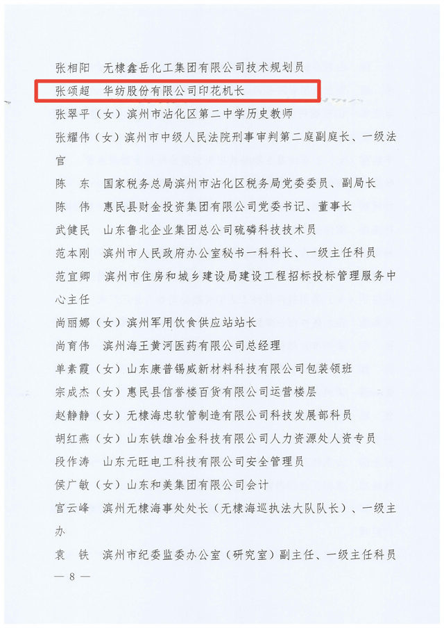 近日,濱州市總工會發(fā)布了“關(guān)于2023年濱州市五一勞動獎和濱州市工人先鋒號的通報”,對獲得濱州市五一勞動獎狀的無棣鑫岳燃化有限公司等26個單位,獲得濱州市五一勞動獎章的丁濤等190名個人,獲得濱州市工人先鋒號的濱州中裕食品有限公司面條三車間等30個集體予以通報表揚。其中,公司花布車間印花機機長張頌超榮獲2023年濱州市五一勞動獎章。
