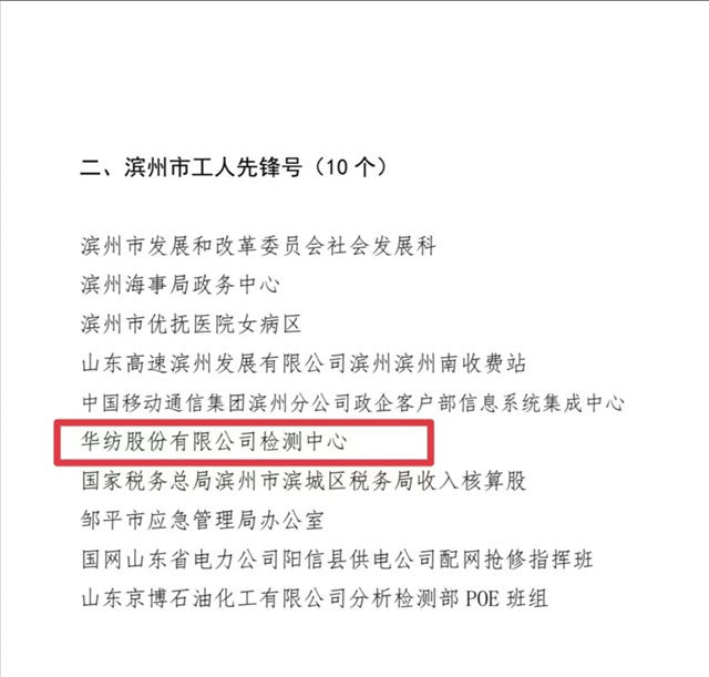 近日,濱州市總工會(huì)印發(fā)“關(guān)于濱州市五一勞動(dòng)獎(jiǎng)?wù)潞蜑I州市工人先鋒號(hào)的通報(bào)”,對(duì)華紡股份有限公司檢測(cè)中心等“濱州市十佳建功立業(yè)標(biāo)兵崗”的集體,授予“濱州市工人先鋒號(hào)”榮譽(yù)稱號(hào)。