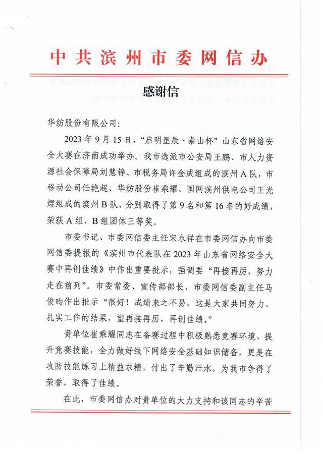 近日,公司收到一封來自濱州市委網(wǎng)信辦的感謝信,信中高度肯定了公司互聯(lián)信息部信息中心信息安全管理員崔乘耀在2023年9月15日“啟明星辰·泰山杯”山東省網(wǎng)絡(luò)安全大賽中所做出的突出貢獻(xiàn),信中指出:“貴單位崔乘耀同志在備賽過程中積極熟悉競賽環(huán)境、提升競賽技能,全力做好線下網(wǎng)絡(luò)安全基礎(chǔ)知識儲備,更是在攻防技能練習(xí)上精益求精,付出了辛勤汗水,為我市爭得了榮譽(yù),取得了佳績。”