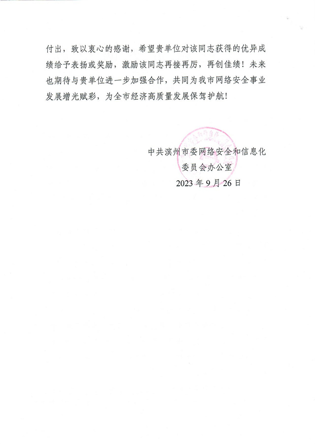 導(dǎo)讀:近日,公司收到一封來自濱州市委網(wǎng)信辦的感謝信
