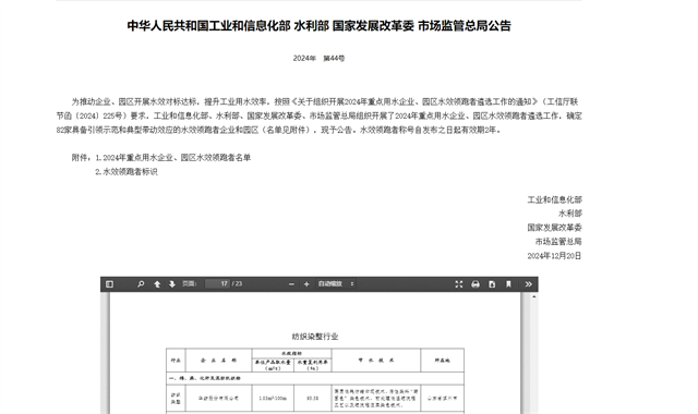 導讀:日前,國家工信部、水利部、發(fā)展改革委、市場監(jiān)管總局等四部門聯(lián)合公示了“2024年重點用水企業(yè)、園區(qū)水效領(lǐng)跑者名單”,公司成功入選國家級重點企業(yè)水效領(lǐng)跑者